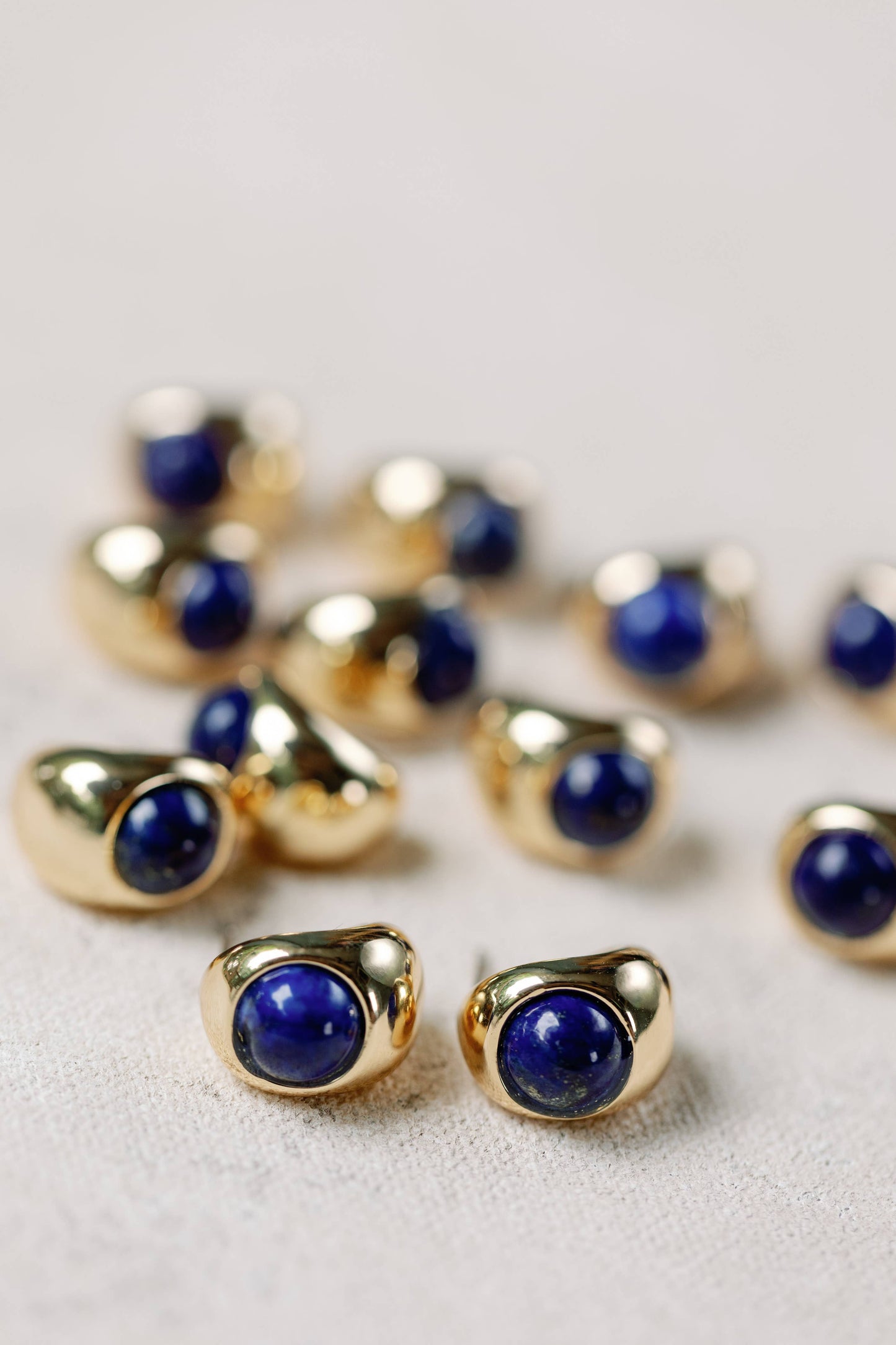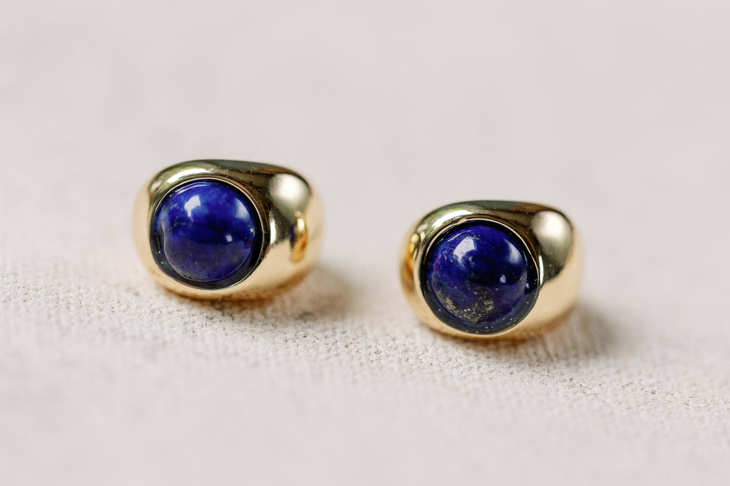 Vintage-Inspired Lapis Huggies. A modern twist on a timeless design, these square mini hoops shine in warm gold tones accented with deep blue lapis. The chunky silhouette makes them the perfect “huggie” statement earring—bold enough to turn heads, yet refined for everyday wear. Classic elegance with a pop of rich color.
