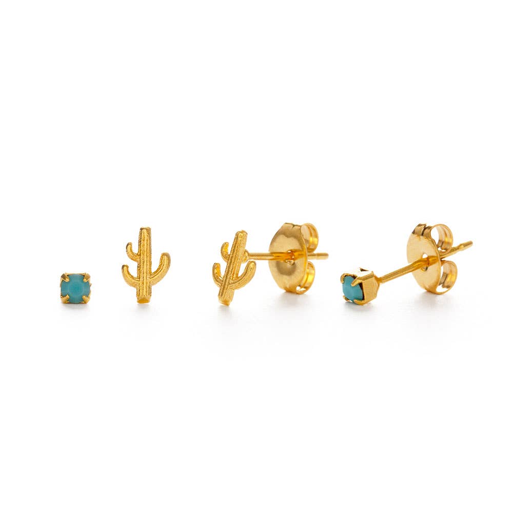 Western style and desert inspiration.... a little homage to Arizona, two tiny saguaro cactus and turquoise color Czech crystal stud earrings. Let your earring stack tell a story! Made of 14k gold plated brass. Lead and nickel free.