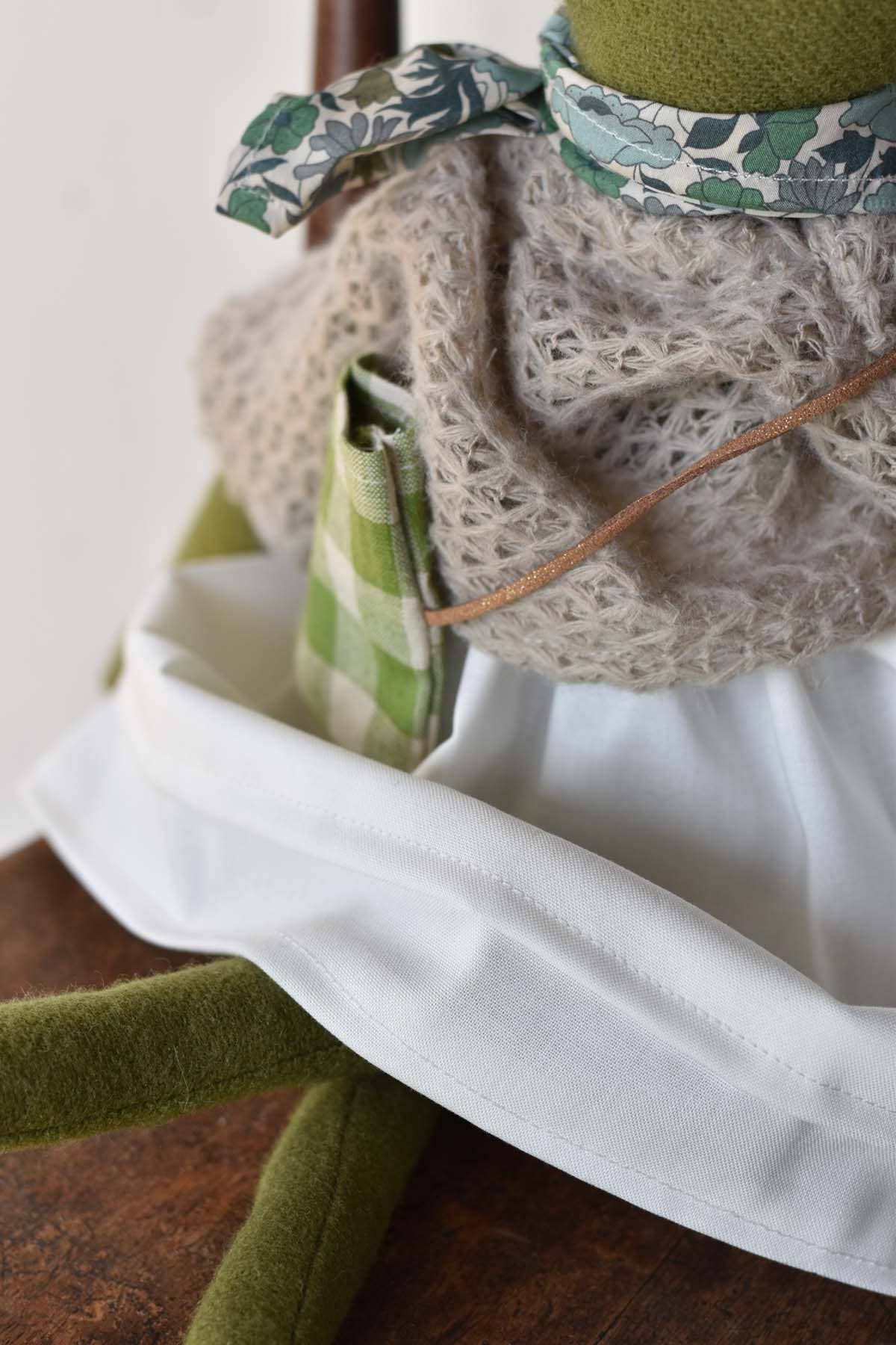 From orchard strolls to afternoon letter writing, Fern is always dressed with intention. She’s wearing a crisp white layered skirt paired with a hand-knit oat-colored sweater that echoes the coziness of fall in the garden. Around her neck, she’s tied a floral Liberty print handkerchief, and her soft green gingham satchel is just the right size for tucking away penpal letters and fig jam recipes.