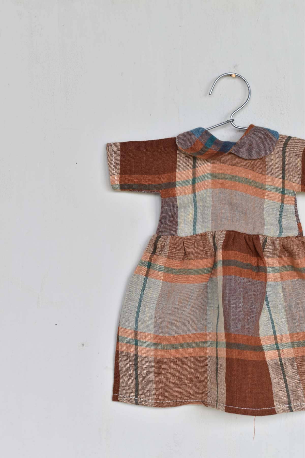A cozy harvest-inspired favorite from the Orchard Collection Crafted from a beautifully textured linen in a warm palette of rust, clay, olive, and soft oat, this plaid doll dress captures the richness of autumn in the orchard. The Peter Pan collar and gathered waist add timeless charm, while the soft, breathable fabric allows for easy seasonal layering.