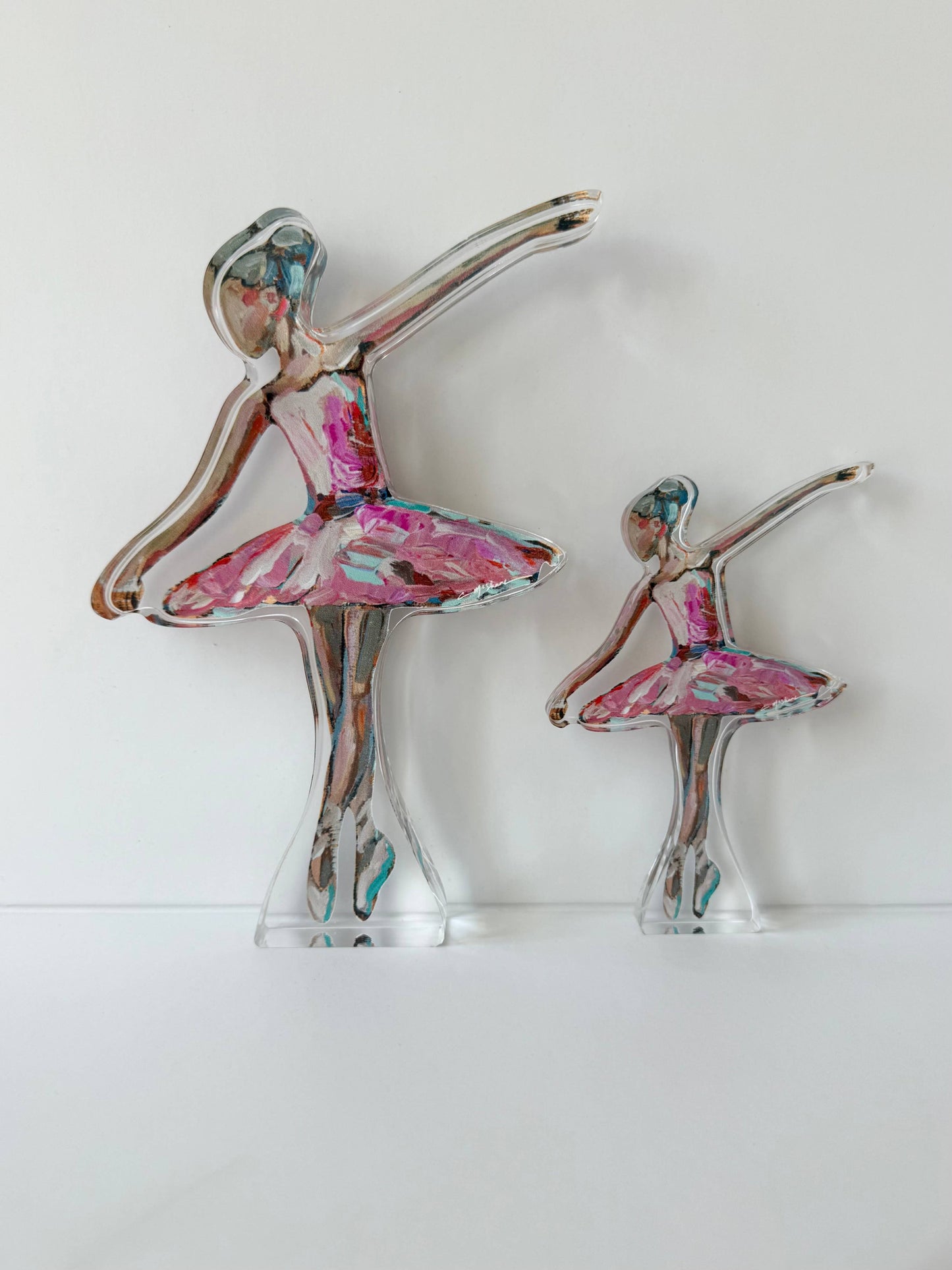 This graceful acrylic ballerina captures the poise and elegance of dance in mid-pirouette. Vivid brushstroke details in warm reds, pinks, and golds give her tutu movement and depth, while the clear acrylic form catches the light beautifully from every angle.