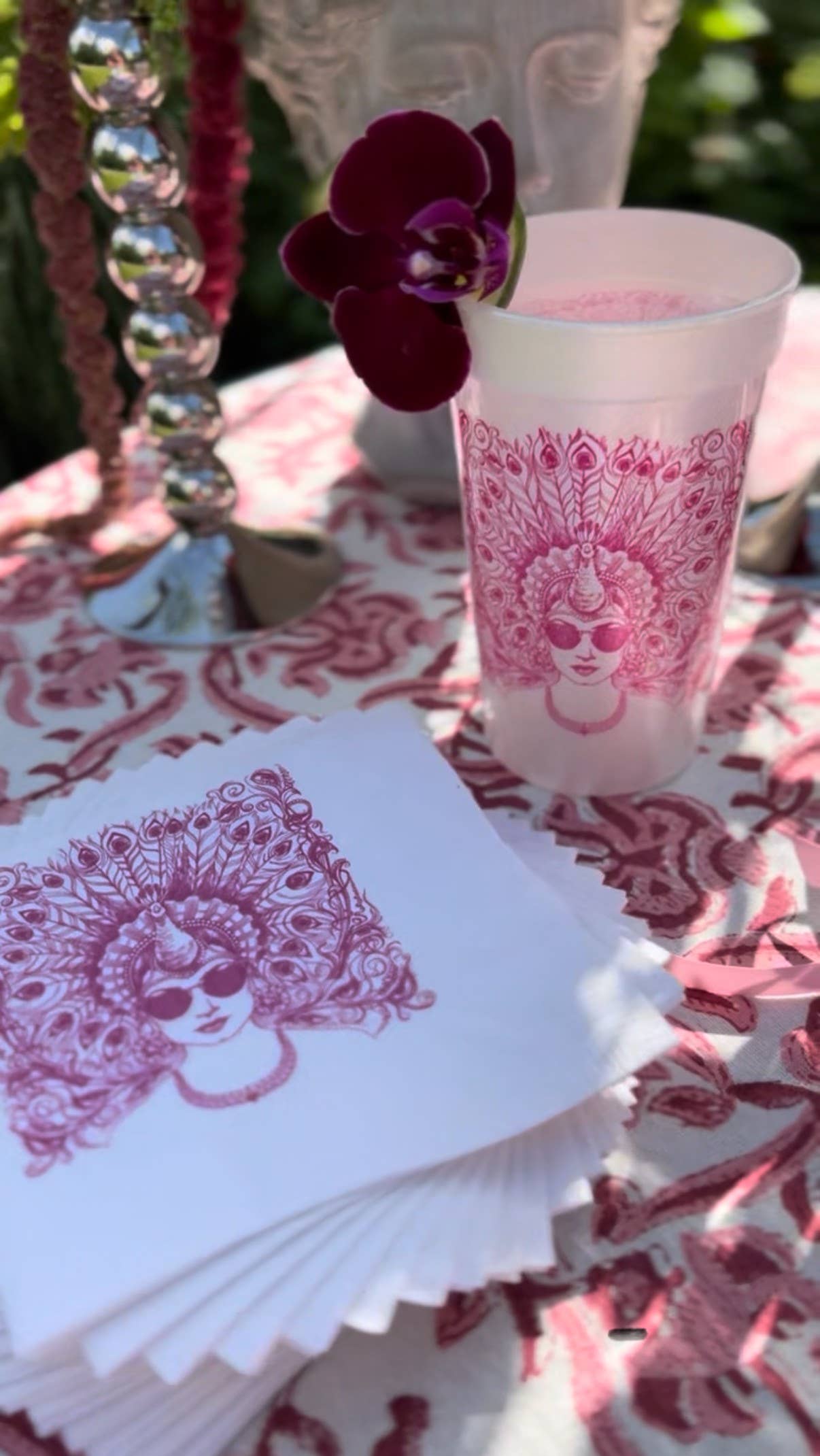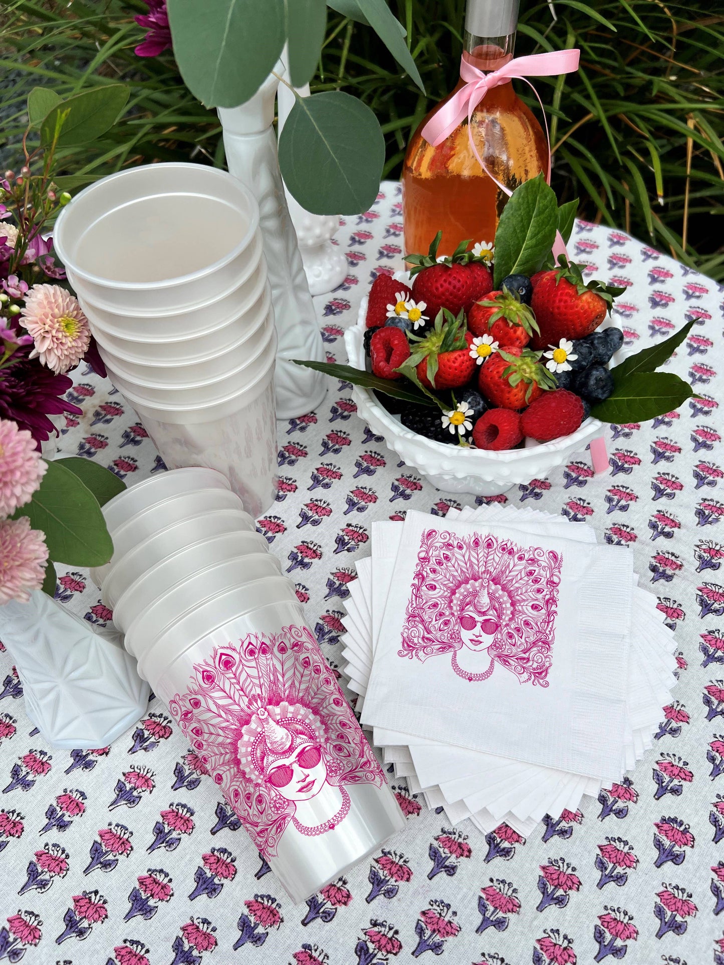 Take your drink to go! Elegant pink Peacock Madam Pearlized cups are the icing on the cake when it comes to a curated party. Plus, hand-drawn illustration By Alexa Pulitzer is the perfect addition to any outdoor gathering and party!