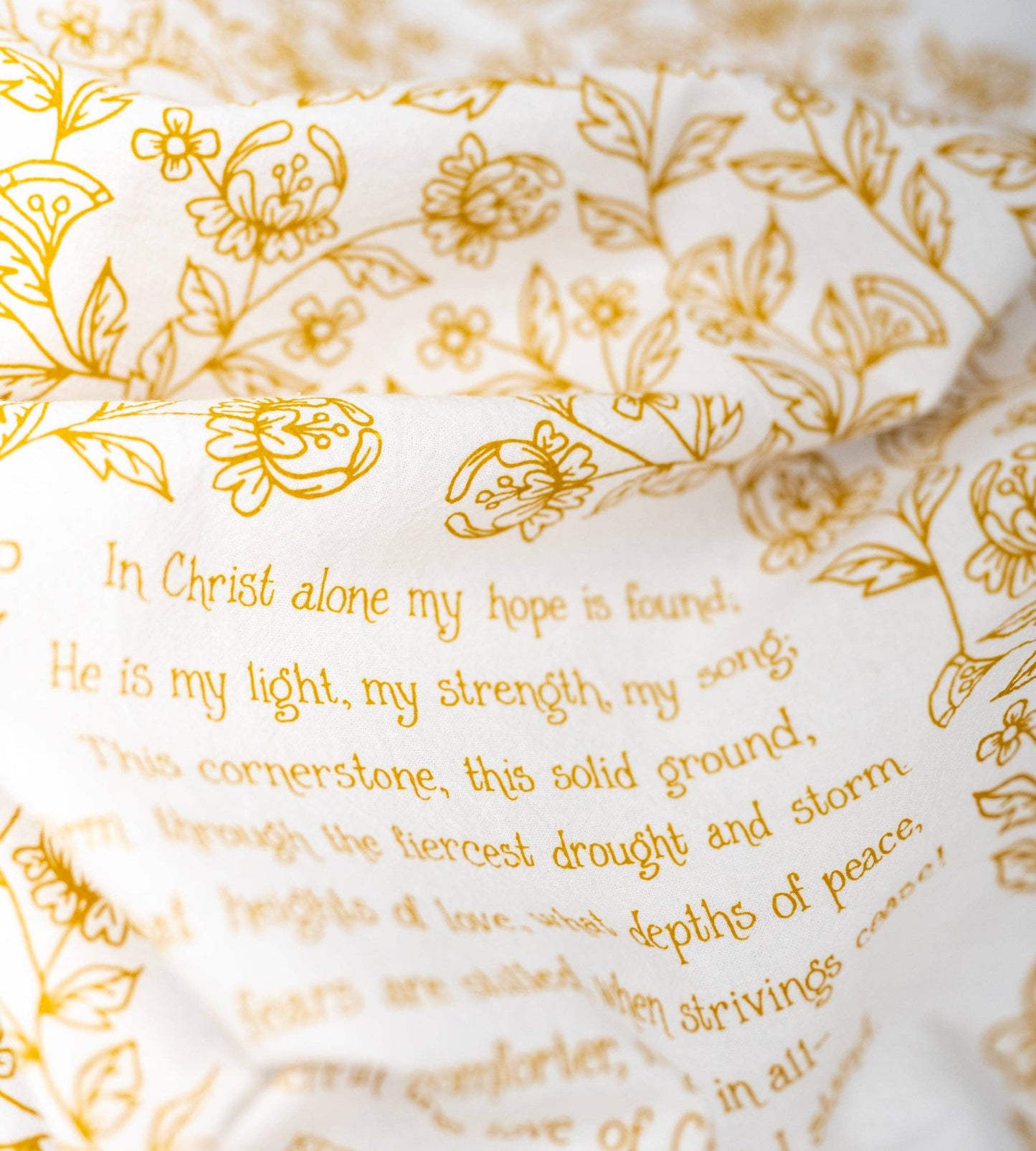 The In Christ Alone hymn tea towel is printed in honey gold and features lyrics from the hymn.