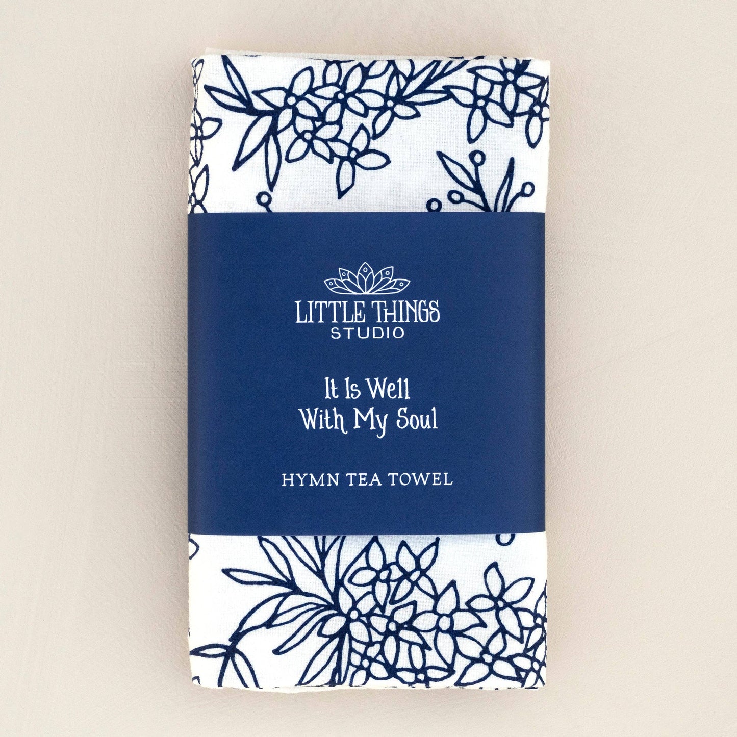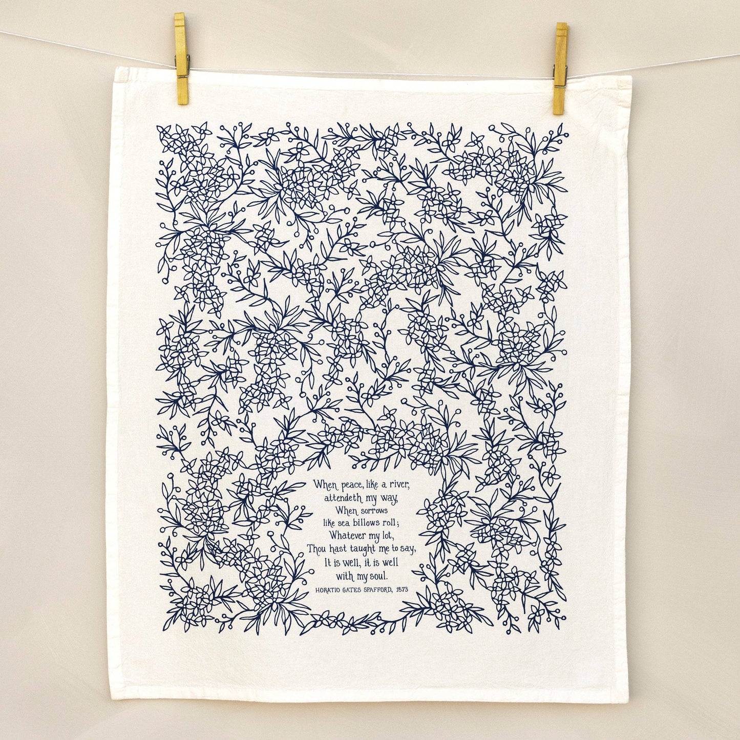Brighten your home with color and song. The It Is Well With My Soul hymn tea towel is printed in navy and features lyrics from the hymn.