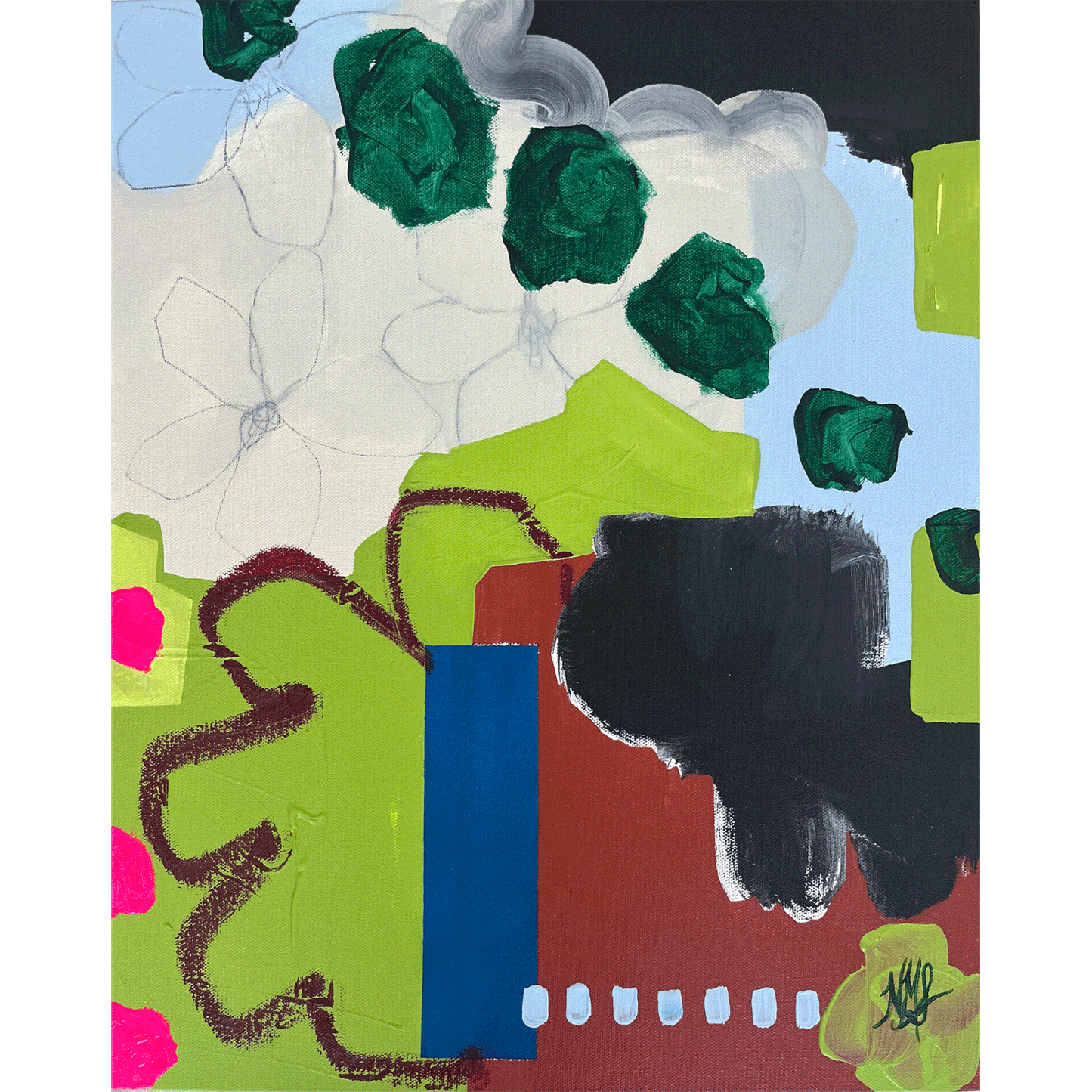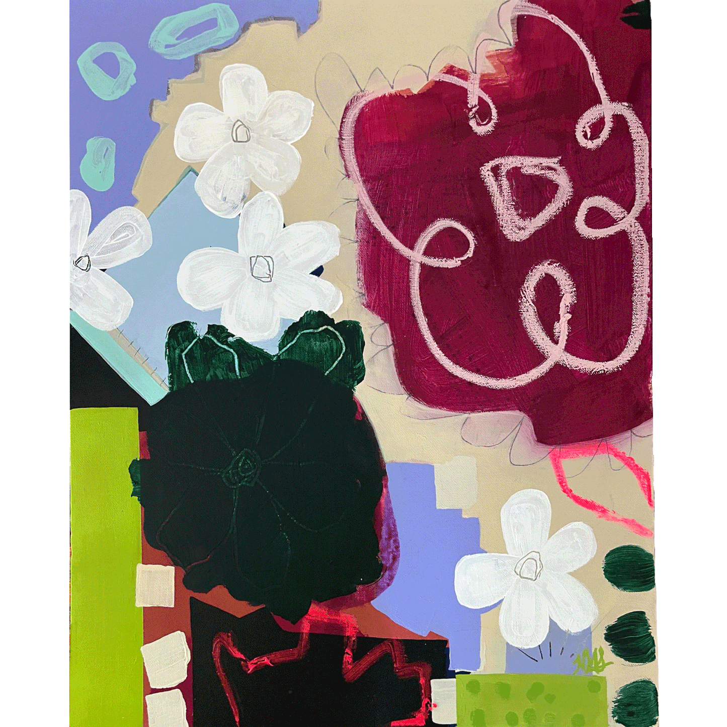 Nicole Simms is an Alabama-based artist with a passion for color. Whether creating abstract pieces or still-life works, she enjoys experimenting with various color combinations, textures, and patterns. Many of her paintings are inspired by the floral arrangements she designs using the plants and flowers from her garden. However, a beautiful textile, old tile, or vintage pottery might also be a source of inspiration! When she isn’t working with paint, you can find her drawing in one of the many sketchbooks she keeps lying around, which she describes as Zen work.